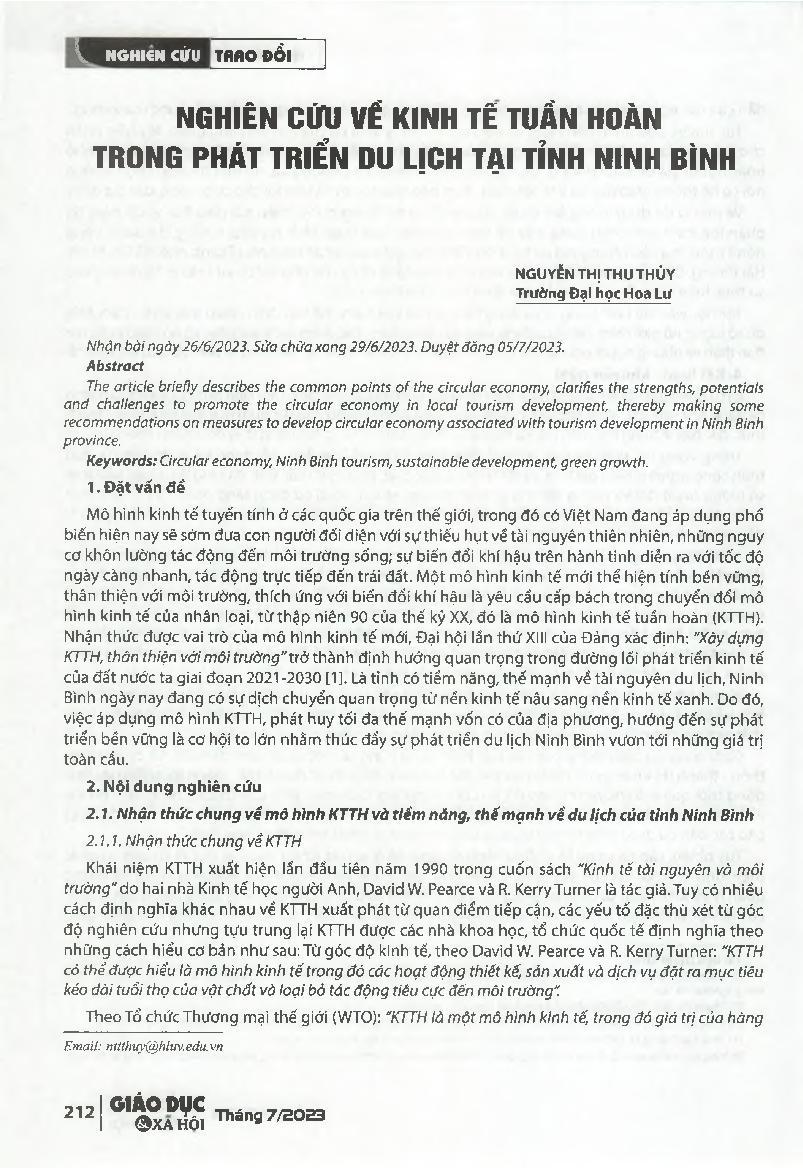 Nghiên cứu về kinh tế tuẫn hoàn trong phát triển du lịch tại tỉnh Ninh Bình = Research on the circular economy in tourism development in Ninh Binh province.