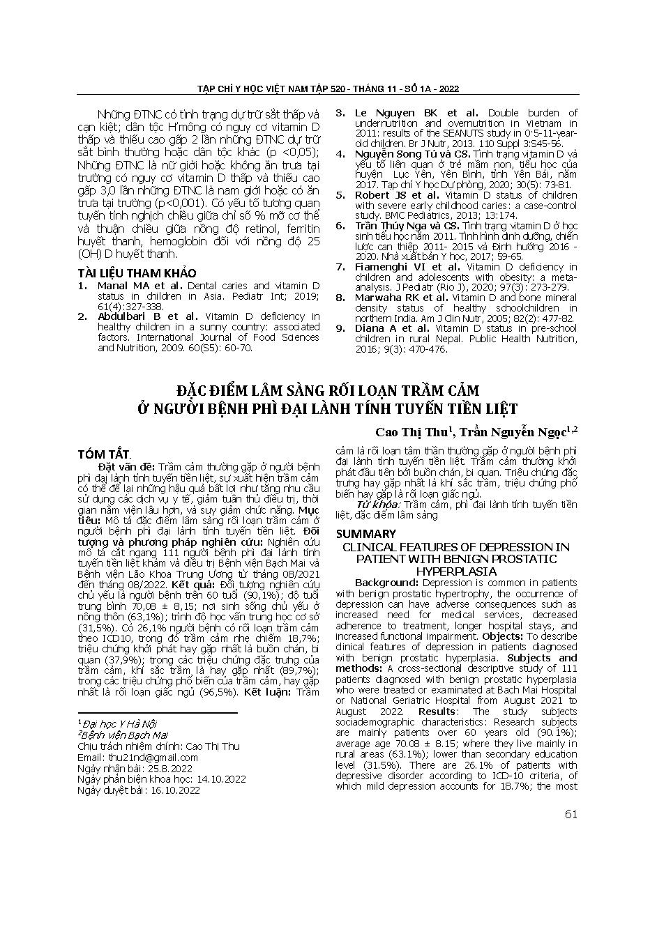 Đặc điểm lâm sàng rối loạn trầm cảm ở người bệnh phì đại lành tính tuyến tiền liệt = Clinical features of depression in patient with benign prostatic hyperplasia