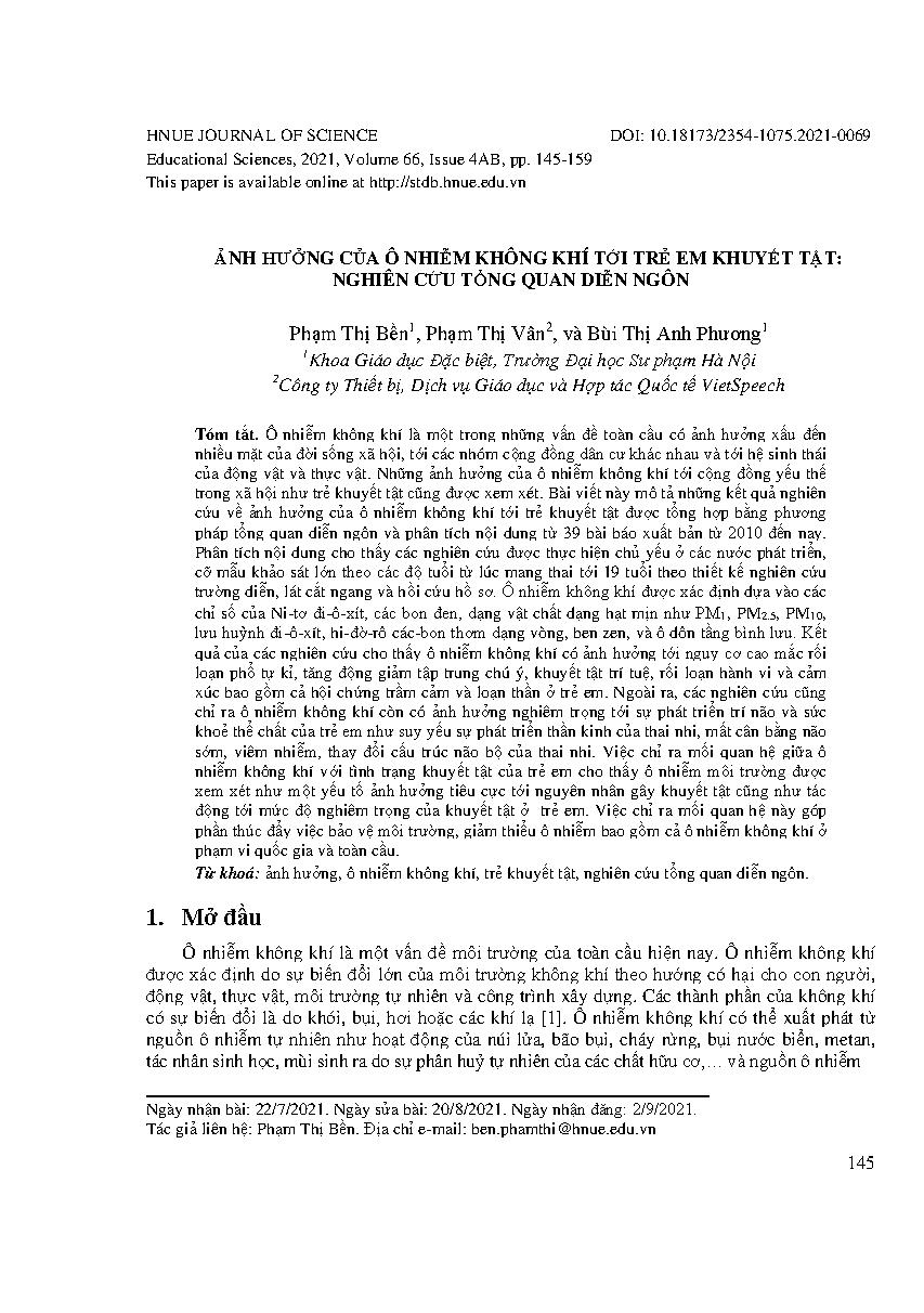 Ảnh hưởng của ô nhiễm không khí tới trẻ em khuyết tật: nghiên cứu tổng quan diễn ngôn = Impacts of air pollution on children with disabilities: A narrative review