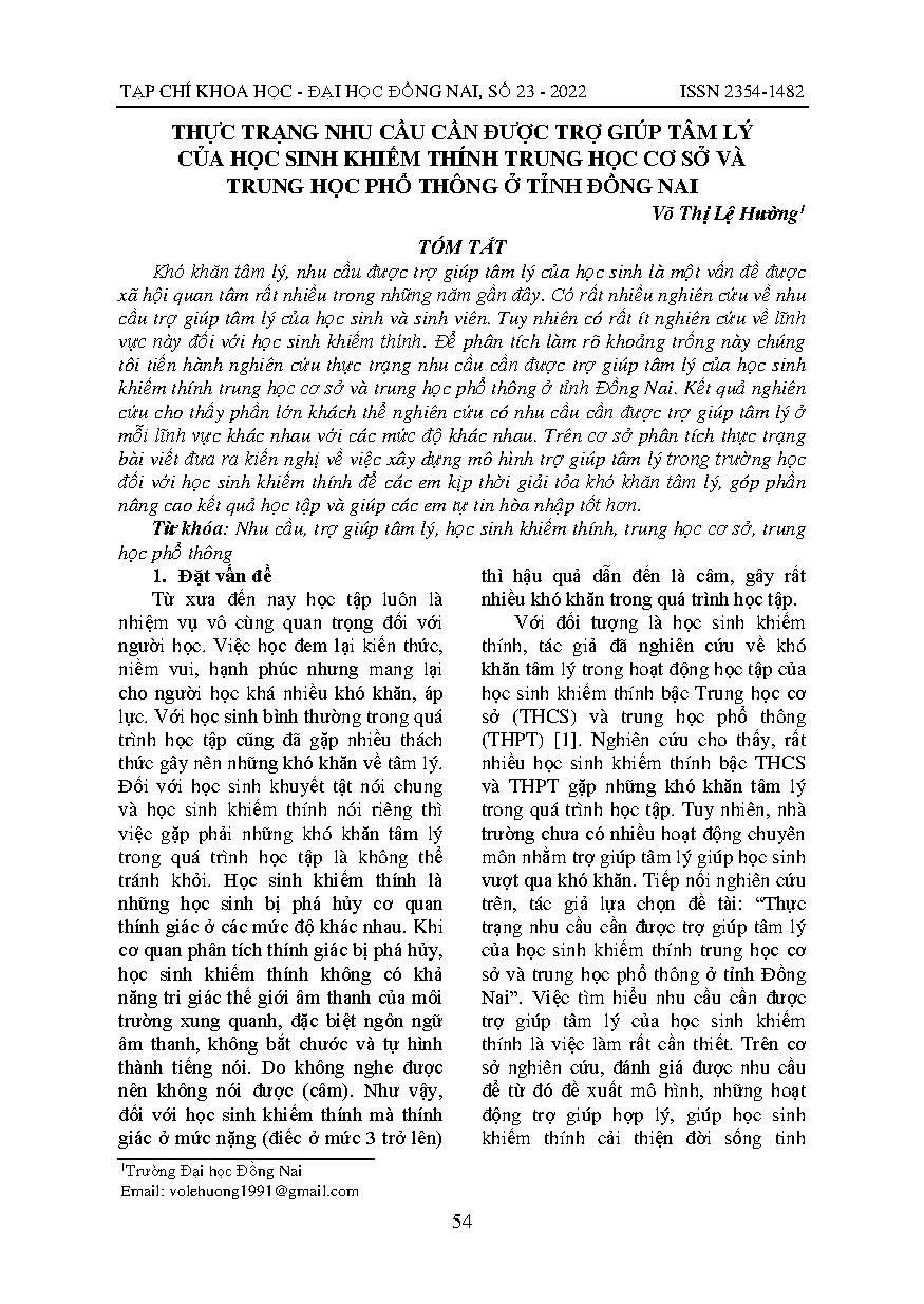 Thực trạng nhu cầu cần được trợ giúp tâm lý của học sinh khiếm thính trung học cơ sở và trung học phổ thông ở tỉnh Đồng Nai = The current demands for psychological support of secondary school and high school hearing impaired students in dong nai province