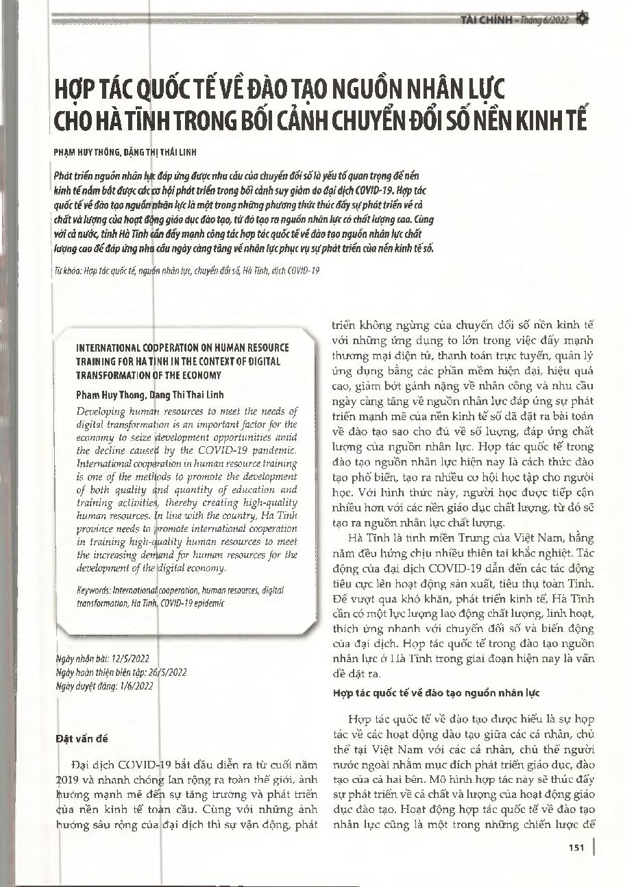 Hợp tác quốc tế về đào tạo nguồn nhân lực cho Hà Tĩnh trong bối cảnh chuyển đổi số nền kinh tế = International cooperation on human resource training for Ha Tinh in the context of digital transformation of the economy