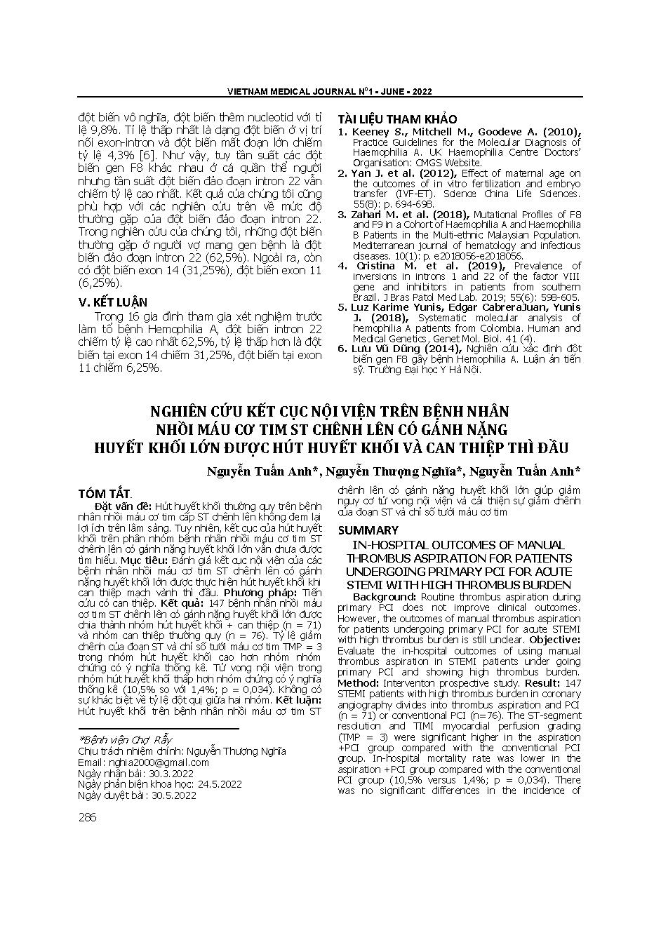 Nghiên cứu kết cục nội viện trên bệnh nhân nhồi máu cơ tim ST chênh lên có gánh nặng huyết khối lớn được hút huyết khối và can thiệp thì đầu = In-hospital outcomes of manual thrombus aspiration for patients undergoing primary PCT for acute stemi with high