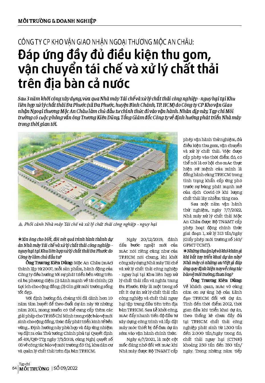 Công ty Cổ phần kho vận giao nhận ngoại thương Mộc An Châu: Đáp ứng đầy đủ điều kiện thu gom, vận chuyển tái chế và xử lý chất thải trên địa bàn cả nước