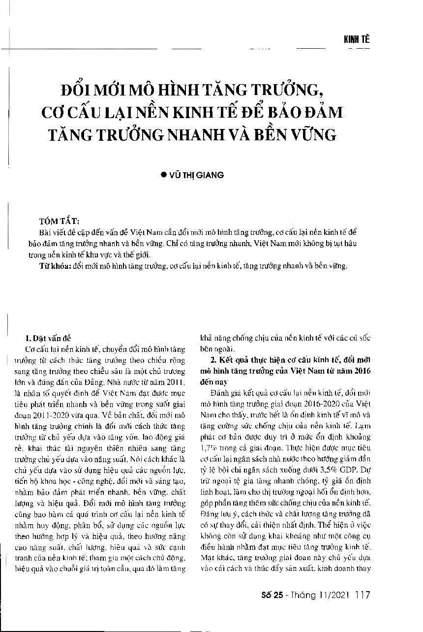 Đối mới mô hình tăng trưởng, cơ cấu lại nền kinh tế để bảo đảm tăng trưởng nhanh và bền vững = Renewing Vietnam's growth model and restructuring the economy to ensure a strong and sustainable growth