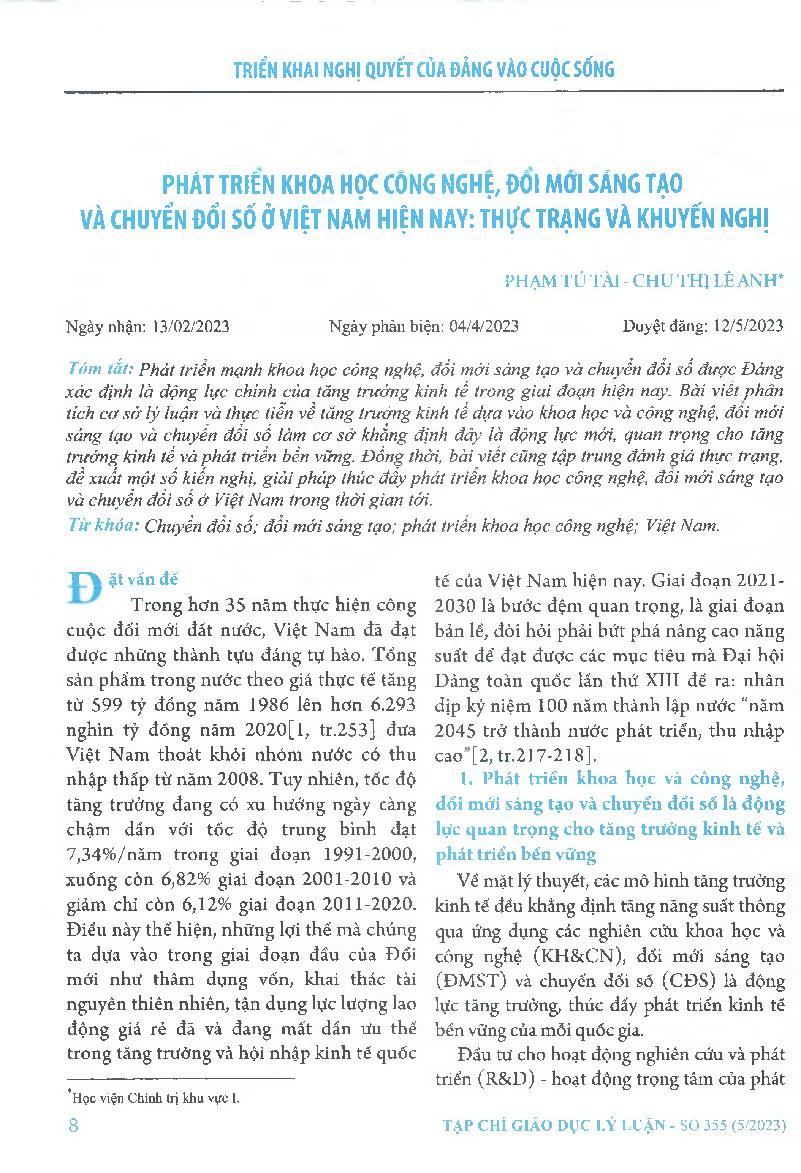 Phát triển khoa học công nghệ, đổi mới sáng tạo và chuyển đổi số ở Việt Nam hiện nay: thực trạng và khuyến nghị = Innovation, digital transformation, and science and technology development in Vietnam today: situational analysis and recommendations