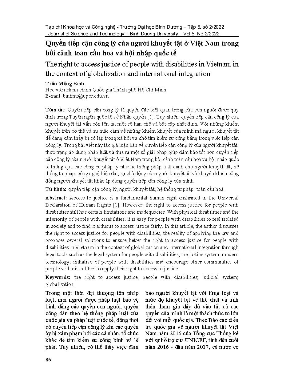 Quyền tiếp cận công lý của người khuyết tật ở Việt Nam trong bối cảnh toàn cầu hoá và hội nhập quốc tế = The right to access justice of people with disabilities in Vietnam in the context of globalization and international integration