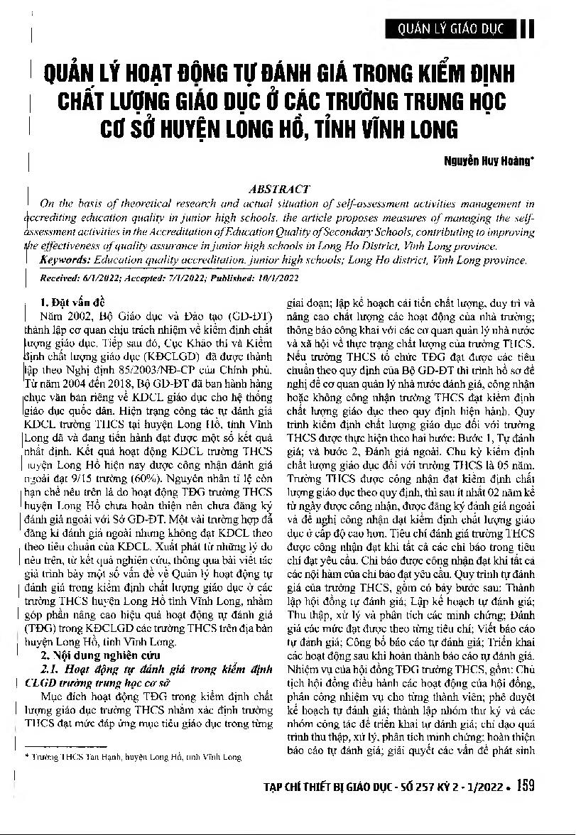 Quản lý hoạt động tự đánh giá trong kiểm định chất lượng giáo dục ở các trường THCS huyện Long Hồ tỉnh Vĩnh Long = Managing the self-assessment activities in education quality accreditation in junior high schools in Long Ho district, Vmh Long province