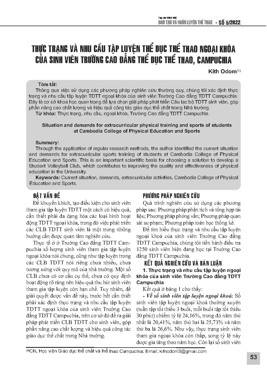 Thực trạng và nhu cầu tập luyện thể dục thể thao ngoại khóa của sinh viên Trường cao đẳng Thể dục thể thao Camphuchia = Situation and demands for extracurricular physical training and sports of students at Cambodia College of Physical Education and Sports