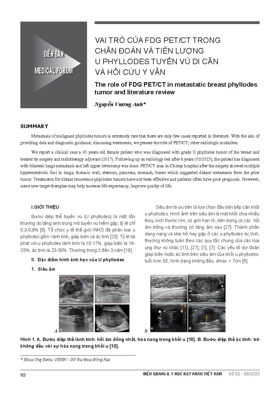 Vai trò của FDG PET/CT trong chẩn đoán và tiên lượng u phyllodes tuyến vú di căn và hồi cứu y văn = The role of FDG PET/CT in metastatic breast phyllodes tumor and literature review
