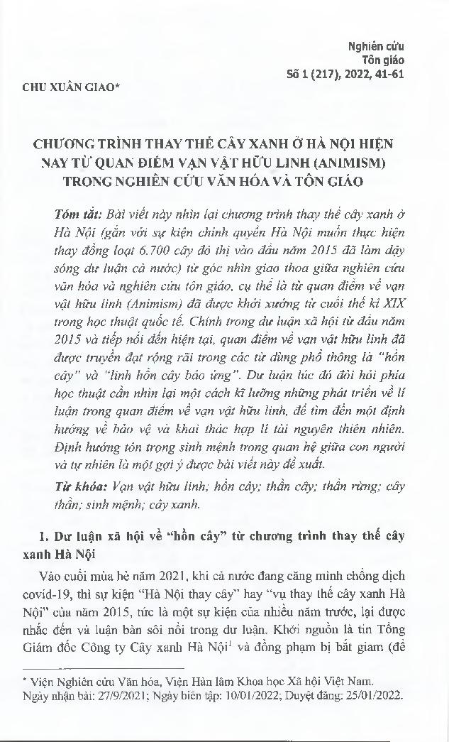 Chương trình thay thế cây xanh ở Hà Nội hiện nay từ quan điểm vạn vật hữu linh (Animism) trong nghiên cứu văn hóa và tôn giáo = Current tree replacement program in Hanoi from viewpoint of Animism in research on culture and religion