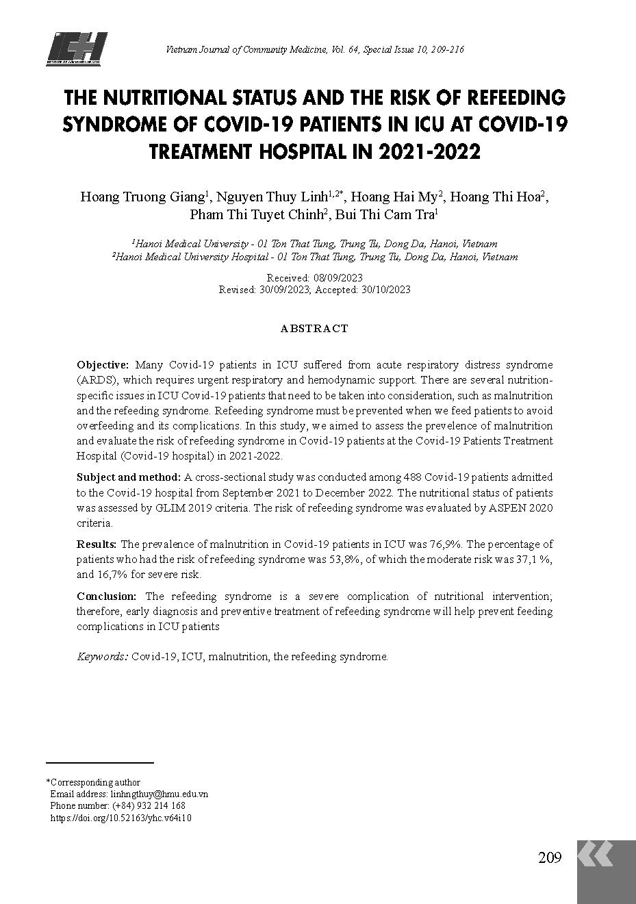 Tình trạng dinh dưỡng và nguy cơ hội chứng nuôi ăn lại của người bệnh trong khoa điều trị tích cực Bệnh viện điều trị người bệnh Covid-19, năm 2021-2022 = The nutritional status and the risk of refeeding syndrome of Covid-19 patients in ICU at Covid-19 tr