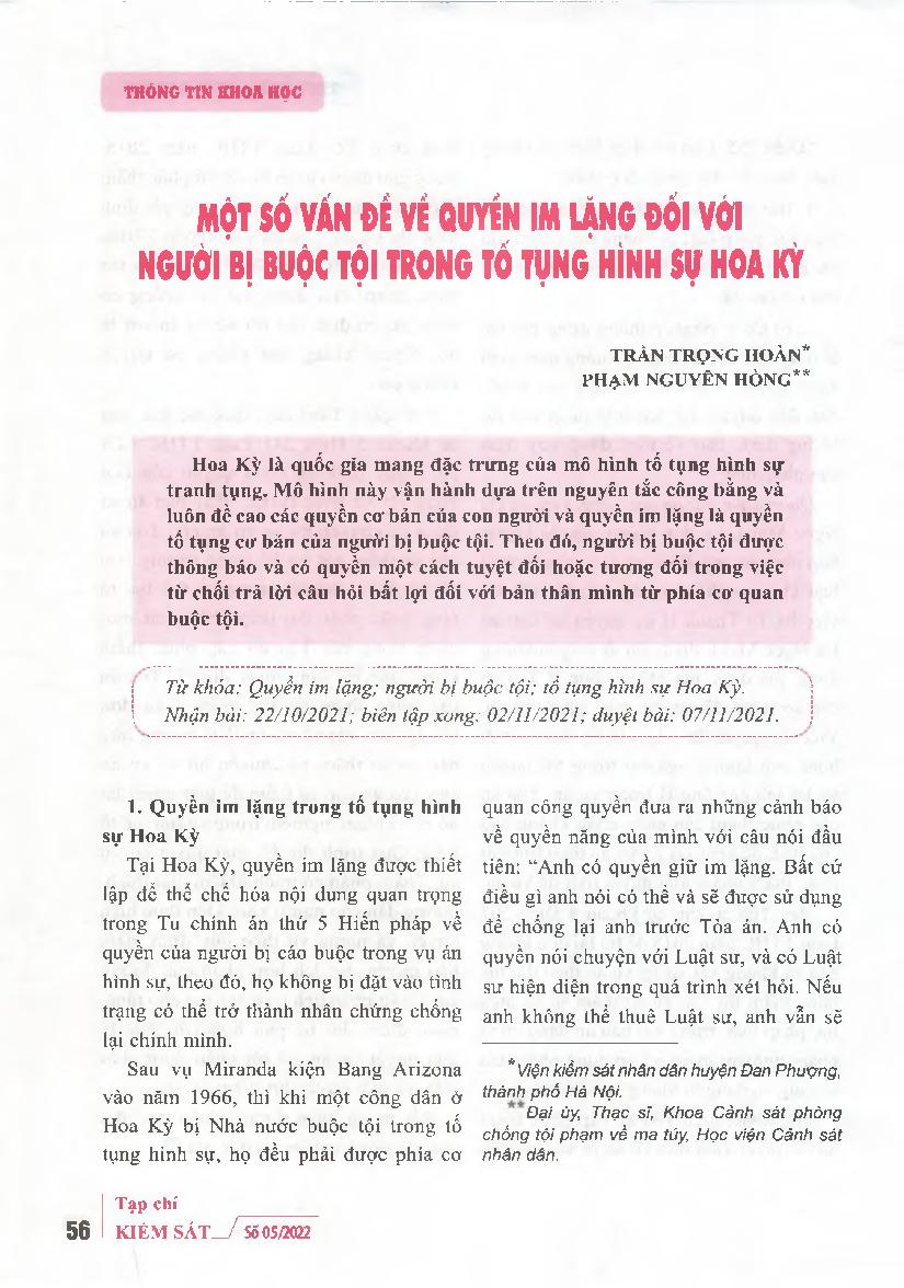 Một số vấn đề về quyền im lặng đối với người bị buộc tội trong tố tụng hình sự Hoa Kỳ