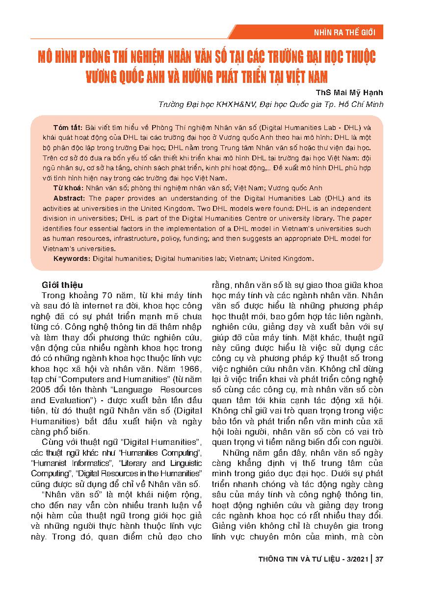 Mô hình phòng thí nghiệm nhân văn số tại các trường đại học thuộc Vương quốc Anh và hướng phát triển tại Việt Nam = Model of digital humanities laboratory at UK universities and development direction in Vietnam