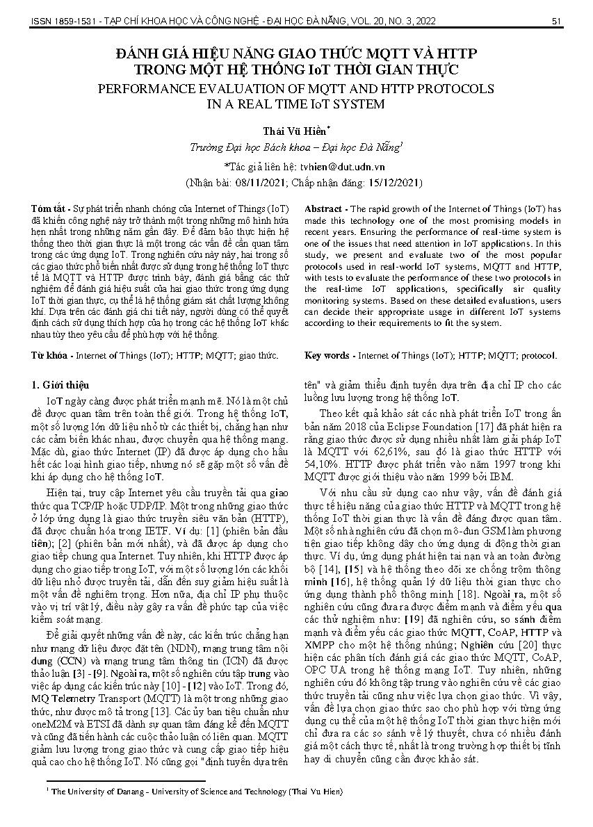Đánh giá hiệu năng giao thức mqtt và http trong một hệ thống iot thời gian thực = Performance evaluation of mqtt and http protocols in a real time iot system