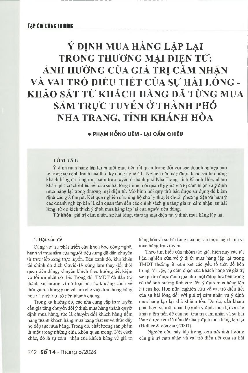 Ý định mua hàng lặp lại trong thương mại điện tử: ảnh hưởng của giá trị cảm nhận và vai trò điều tiết của sự hài lòng - Khảo sát từ khách hàng đã từng mua sắm trực tuyến ở thành phố Nha Trang, tỉnh Khánh Hòa