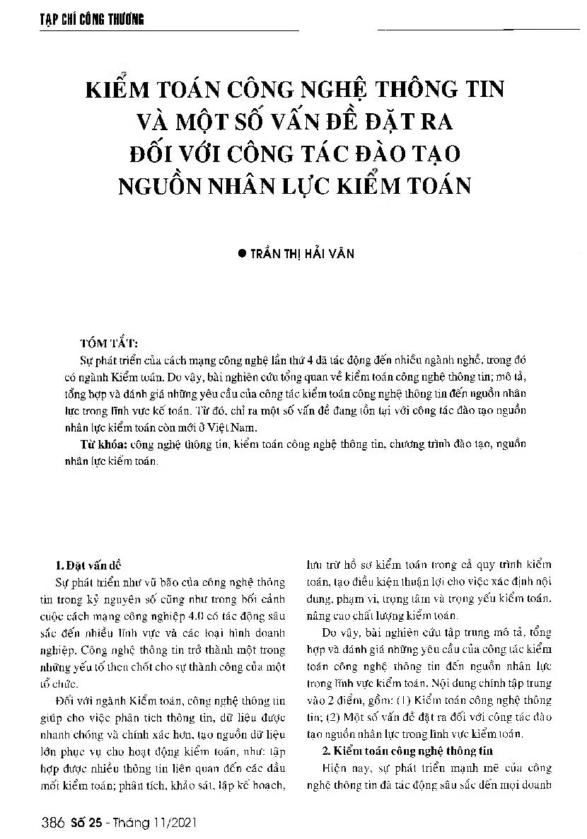 Kiểm toán công nghệ thông tin và một số vấn đề đặt ra đối với công tác đào tạo nguồn nhân lực kiểm toán = Information technology audit and some problems about the human resource training in the auditing sector