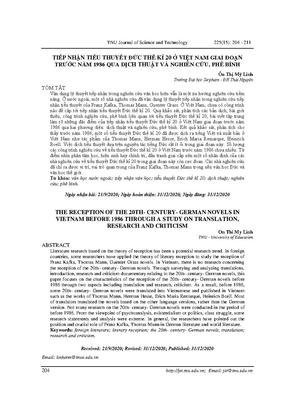 Tiếp nhận tiểu thuyết đức thế kỉ 20 ở Việt Nam giai đoạn trước năm 1986 qua dịch thuật và nghiên cứu, phê bình = The reception of the 20th- century- German novels in vietnam before 1986 through a study on translation, research and criticism