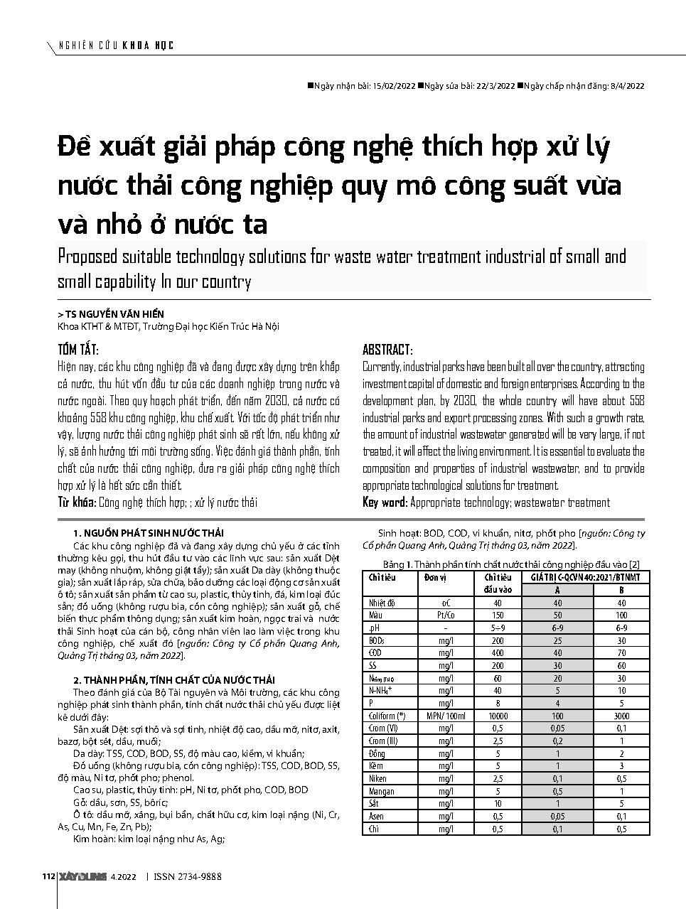 Đề xuất giải pháp công nghệ thích hợp xử lý nước thải công nghiệp quy mô công suất vừa và nhỏ ở nước ta = Proposed suitable technology solutions for waste water treatment industrial of small and small capability In our country