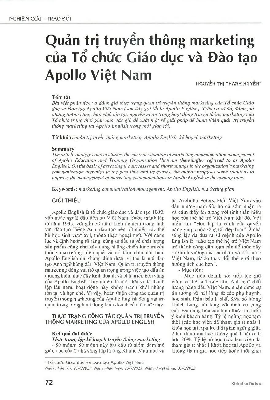 Quản trị truyền thông marketing của Tổ chức Giáo dục và Đào tạo Apollo Việt Nam