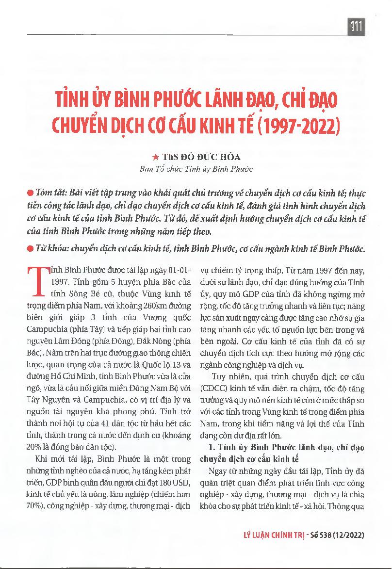 Tỉnh ủy Bình Phước lãnh đạo, chỉ đạo chuyển dịch cơ cấu kinh tế (1997-2022)