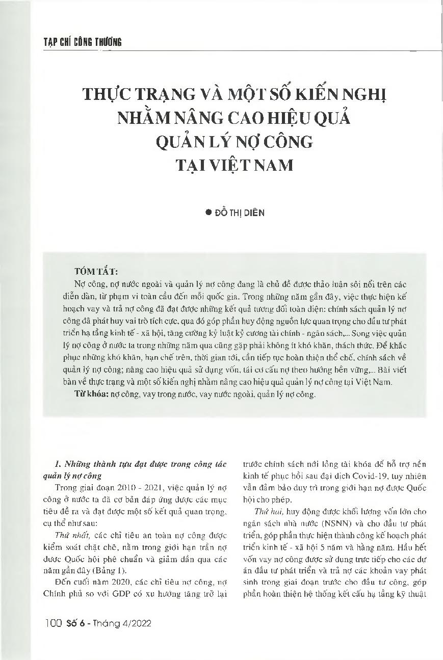 Thực trạng và một số kiến nghị nhằm nâng cao hiệu quả quản lý nợ công tại Việt Nam = Current situation and some recommendations to improve the effectiveness of public debt management in Vietnam