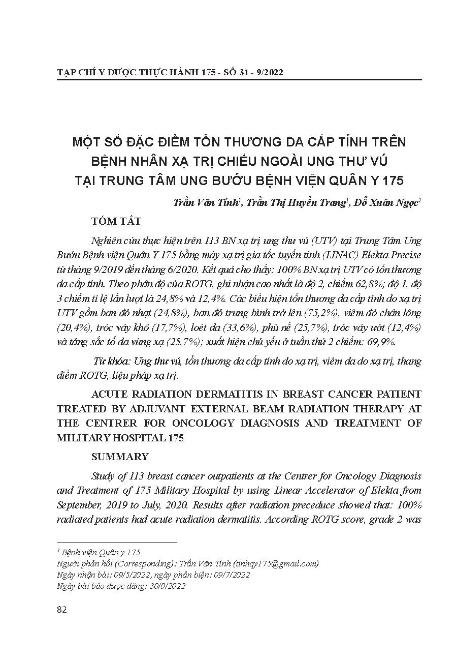 Một số đặc điểm tổn thương da cấp tính trên bệnh nhân xạ trị chiếu ngoài ung thư vú tại trung tâm ung bướu Bệnh viện Quân y 175