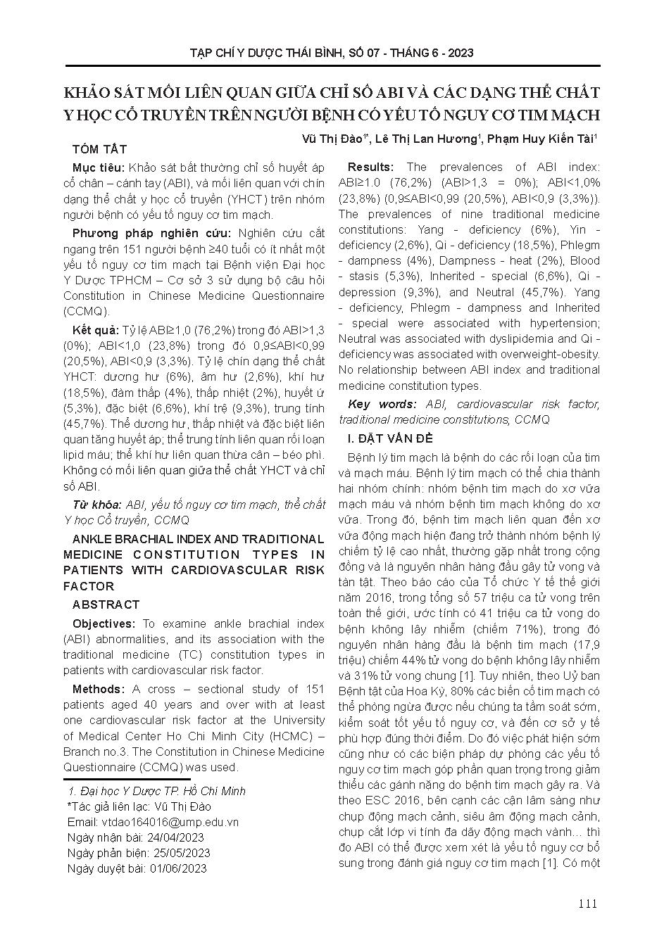 Khảo sát mối liên quan giữa chỉ số ABI và các dạng thể chất y học cổ truyền trên người bệnh có yếu tố nguy cơ tim mạch