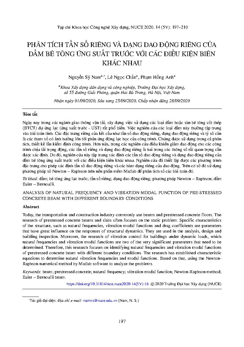 Phân tích tần số riêng và dạng dao động riêng của dầm bê tông ứng suất trước với các điều kiện biên khác nhau = Analysis of natural frequency and vibration modal function of pre-stressed Concrete beam with different boundary conditions
