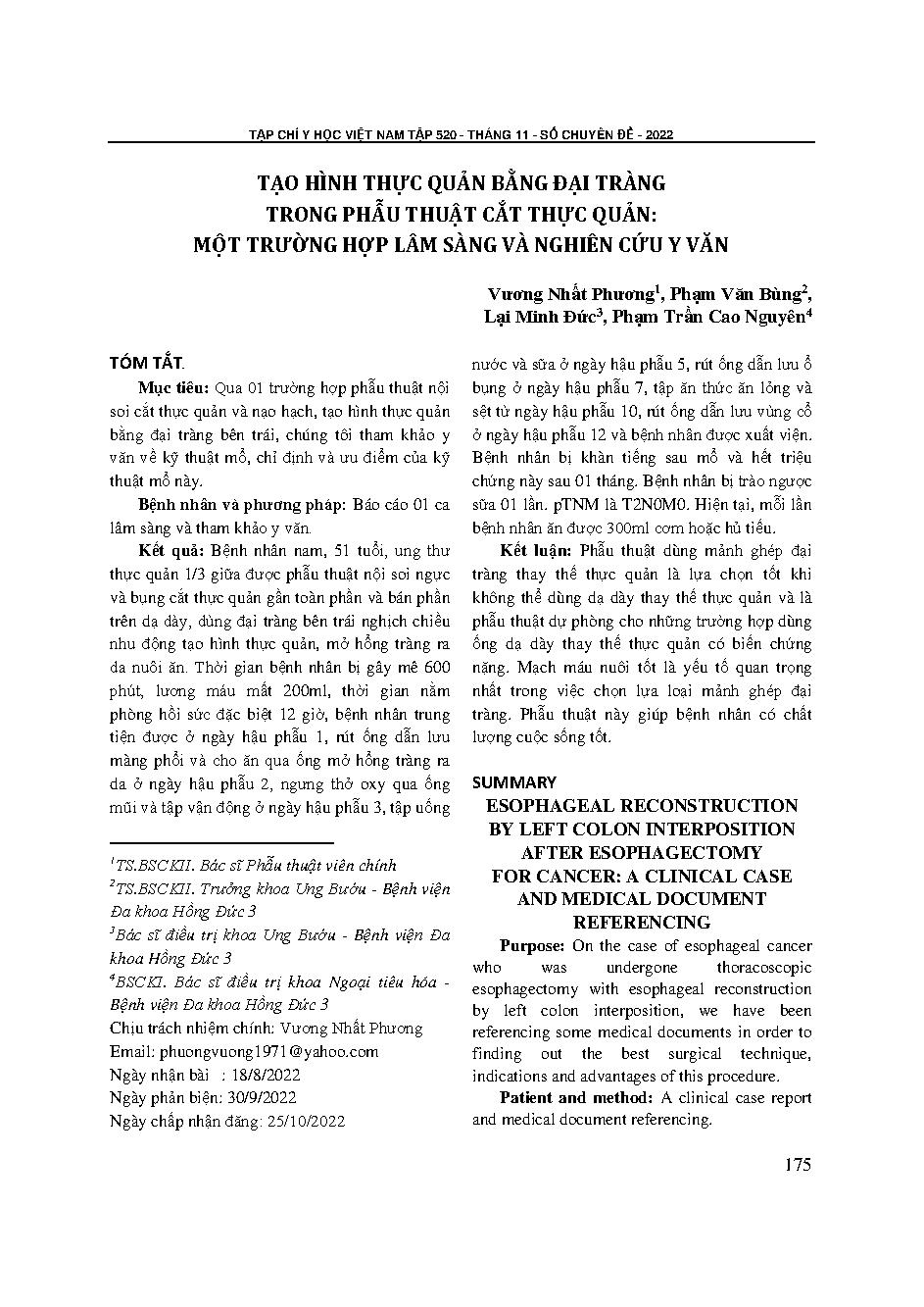 Tạo hình thực quản bằng đại tràng trong phẫu thuật cắt thực quản: Một trường hợp lâm sàng và nghiên cứu y văn = Esophageal reconstruction by left colon interposition after esophagectomy for cancer: A clinical case and medical document referencing