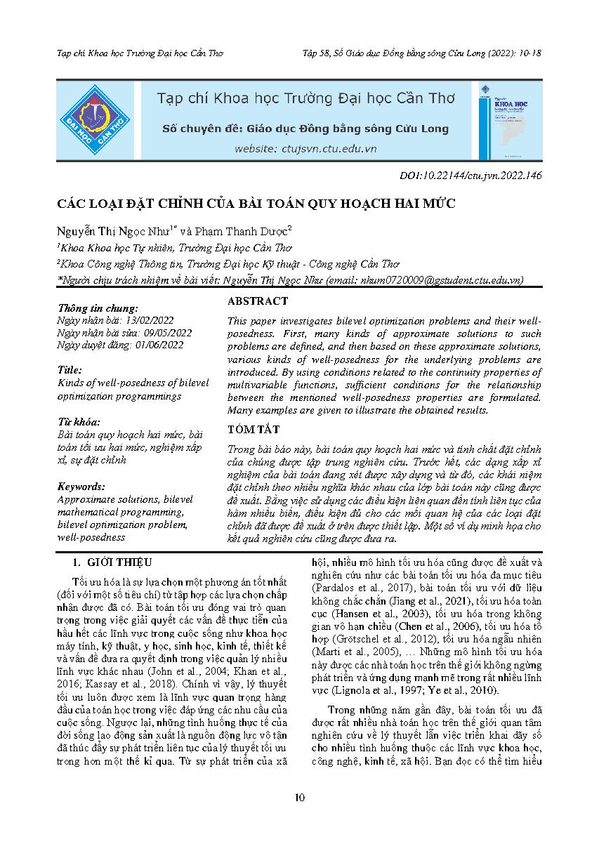 Các loại đặt chỉnh của bài toán quy hoạch hai mức = Kinds of well-posedness of bilevel optimization programmings