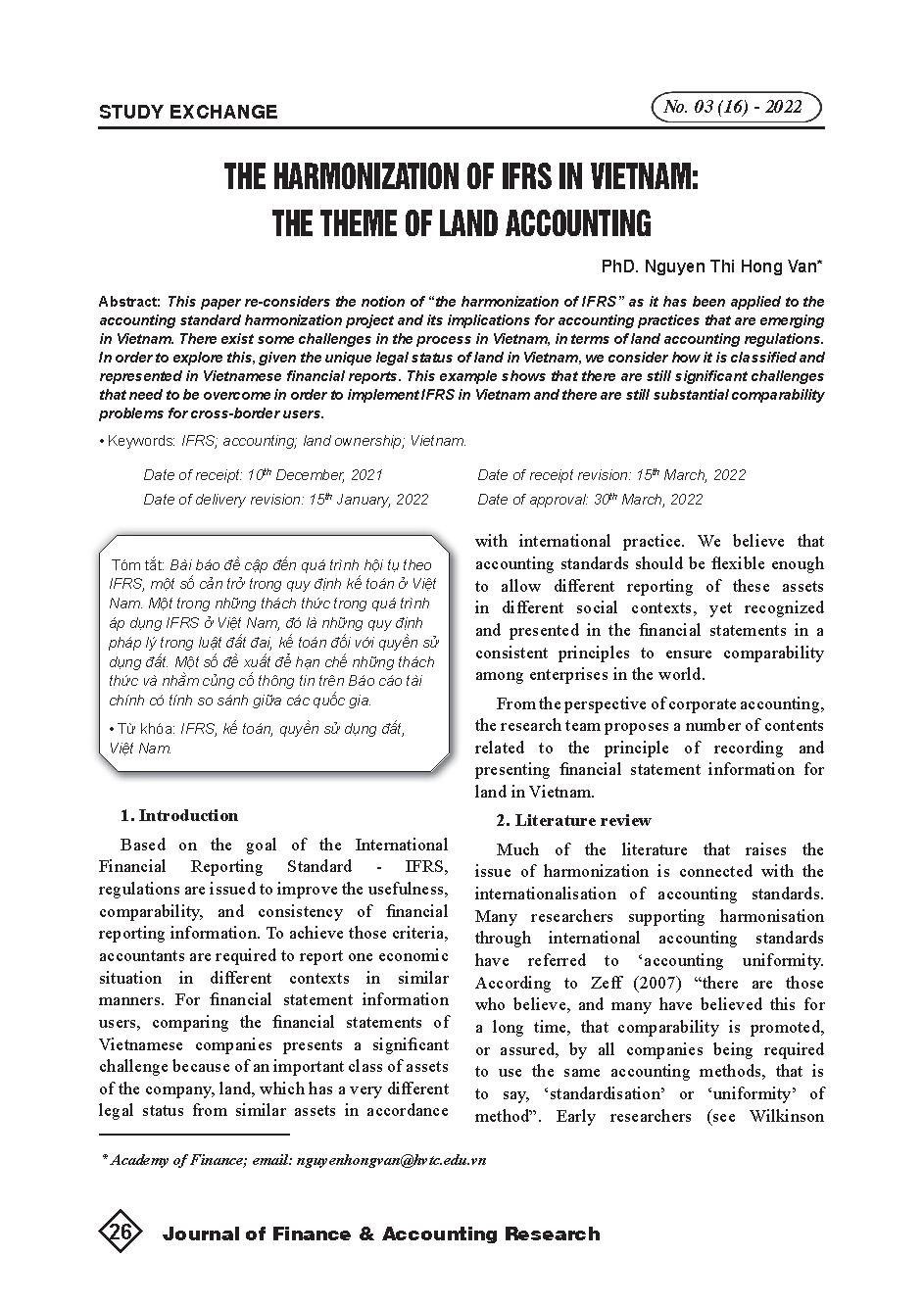 Sự hoà hợp IFRS tại Việt Nam: Về kế toán đất đai = The harmonization of IFRS in Vietnam: The theme of land accounting