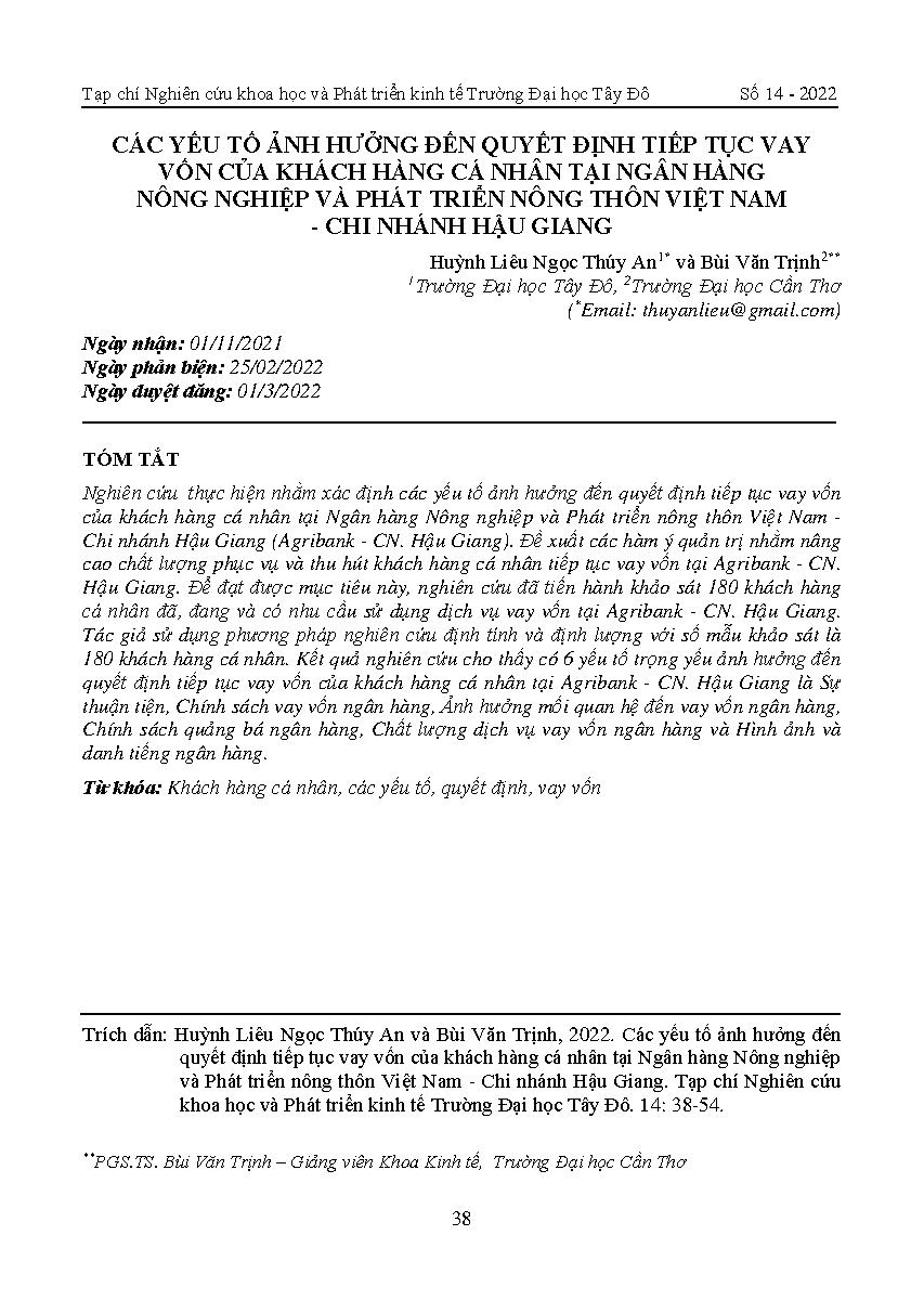 Các yếu tố ảnh hưởng đến quyết định tiếp tục vay vốn của khách hàng cá nhân tại Ngân hàng Nông nghiệp và Phát triển nông thôn Việt Nam - Chi nhánh Hậu Giang = Factors affecting individual customers’ decision to continue loans at Vietnam Bank for Agricultu