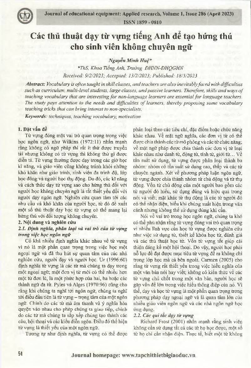 Các thủ thuật dạy từ vựng tiếng Anh để tạo hứng thú cho sinh viên không chuyên ngữ = Techniques for teaching English vocabulary to motivate non-English major students.