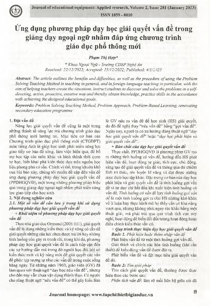 Ứng dụng phương pháp dạy học giải quyết vấn đề trong giảng dạy ngoại ngữ nhằm đáp ứng chương trình giáo dục phổ thông mới = Applying problem-solving teaching methods in foreign language teaching to meet the requirements of the new general education progra