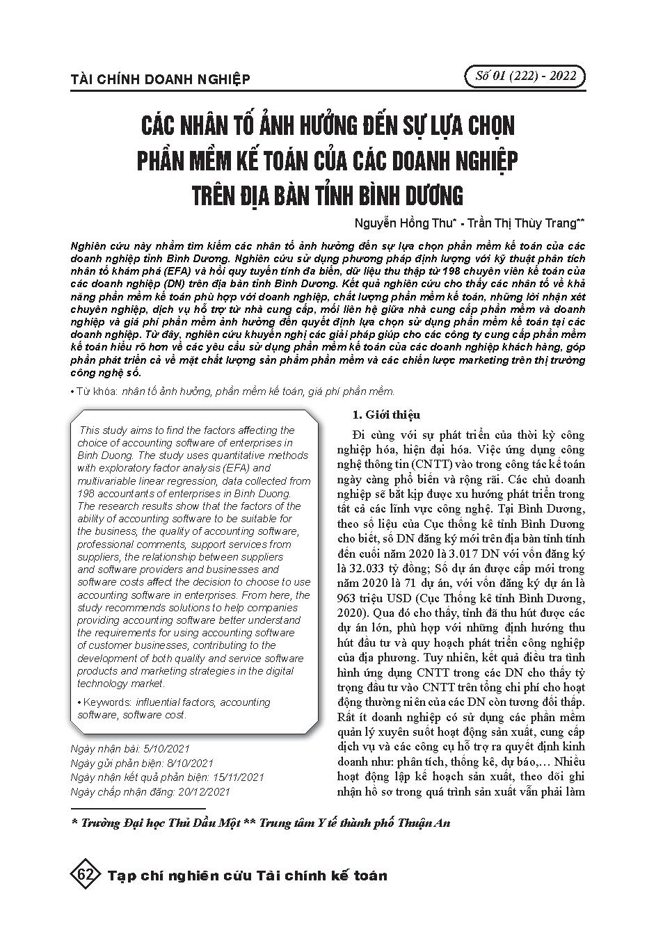 Các nhân tố ảnh hưởng đến sự lựa chọn phần mềm kế toán của các doanh nghiệp trên địa bàn tỉnh Bình Dương = Factors affecting the choice of accounting software of enterprises in Binh Duong province