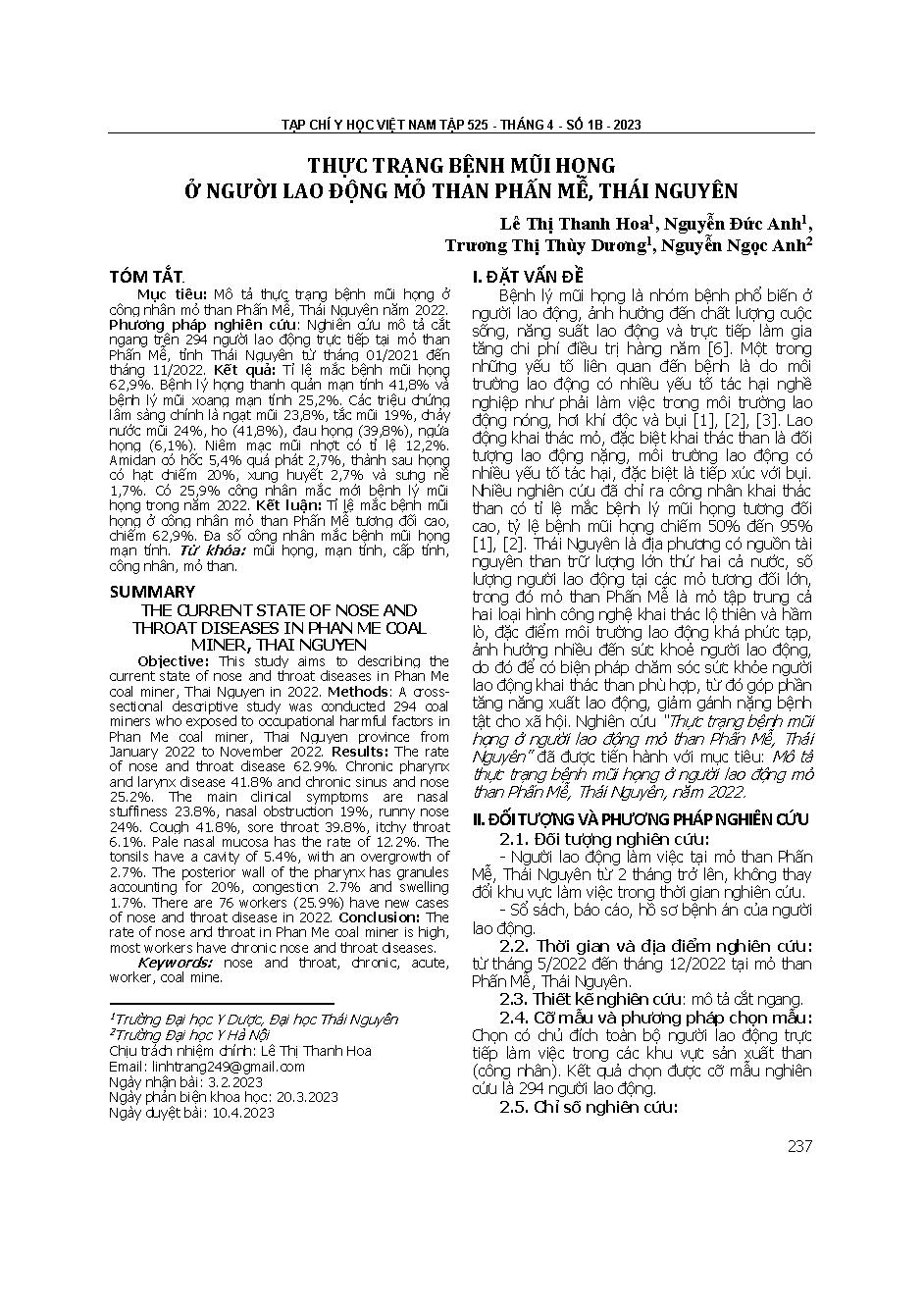 Thực trạng bệnh mũi họng ở người lao động mỏ than Phấn Mễ, Thái Nguyên = The current state of nose and throat diseases in Phan Me coal miner, Thai Nguyen