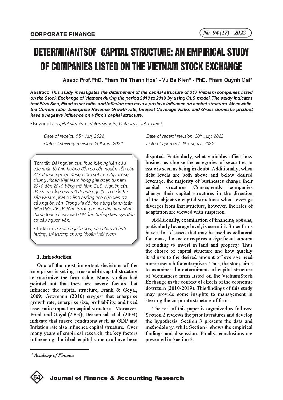 Các yếu tố quyết định đến cấu trúc nguồn vốn: nghiên cứu về các công ty niêm yết trên thị trường chứng khoán Việt Nam = Determinants of capital structure: an empirical study of companies listed on the Vietnam stock exchange