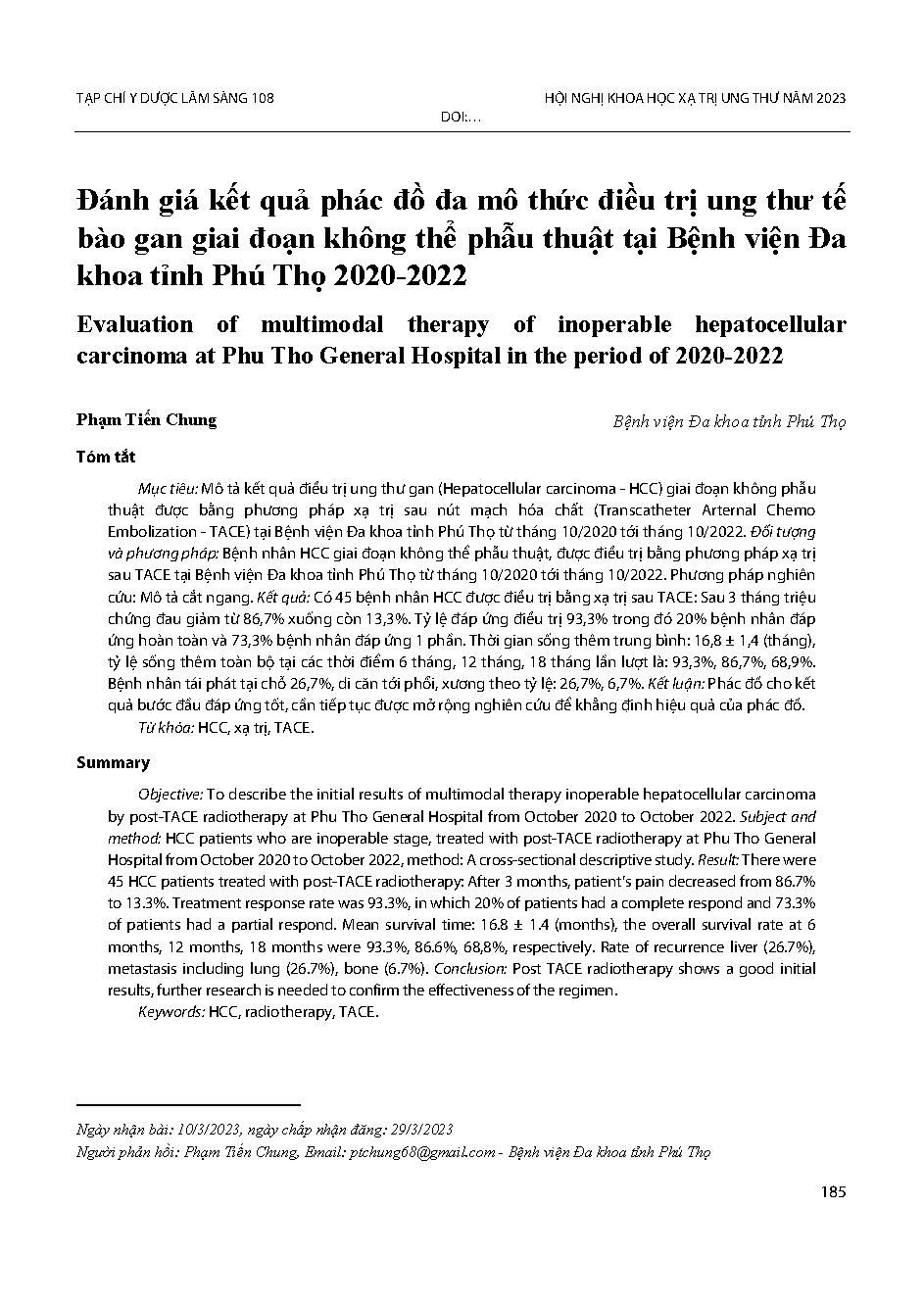 Đánh giá kết quả phác đồ đa mô thức điều trị ung thư tế bào gan giai đoạn không thể phẫu thuật tại Bệnh viện Đa khoa tỉnh Phú Thọ 2020-2022 = Evaluation of multimodal therapy of inoperable hepatocellular carcinoma at Phu Tho General Hospital in the period