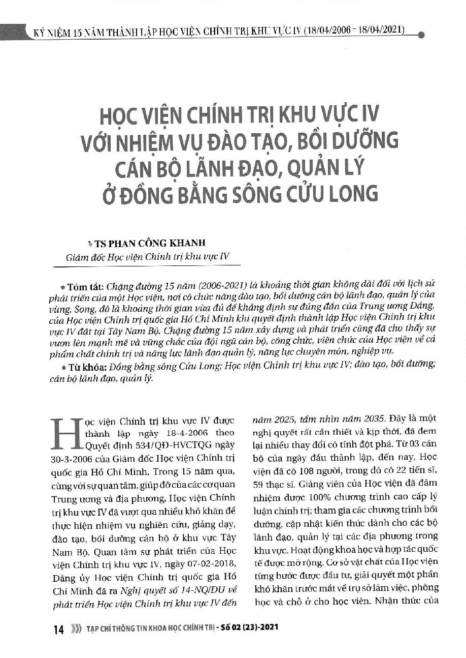 Học viện Chính trị khu vực IV với nhiệm vụ đào tạo, bối dưỡng cán bộ lãnh đạo, qụản lý ở đồng bằng sông Cửu Long