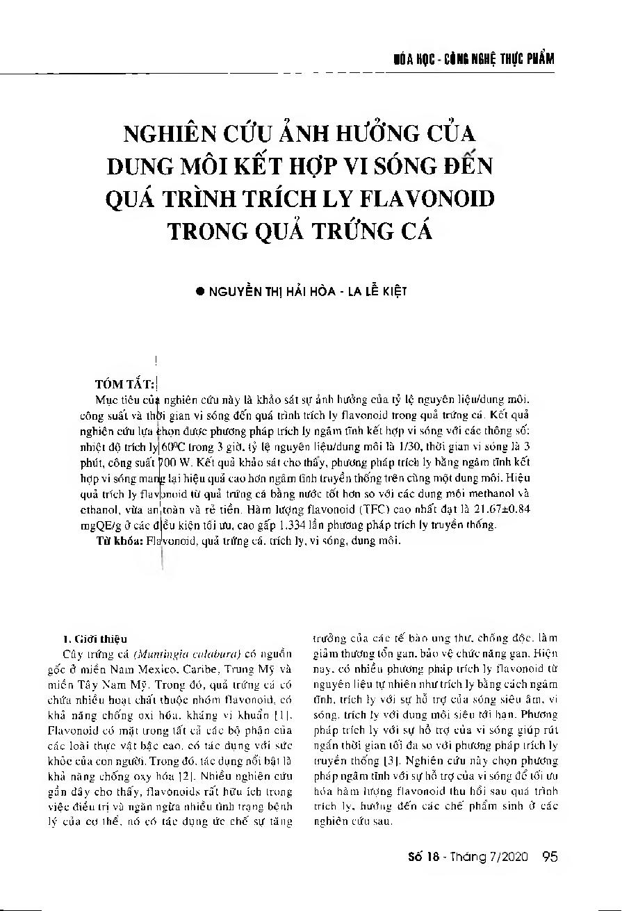 Nghiên cứu ảnh hưởng của dung môi kết hợp vi sóng đến quá trình trích ly flavonoid trong quả trứng cá = Effects of the solvents and the microwave-assisted extraction method on the total flavonoid extraction from Mutingia Calabura fruits
