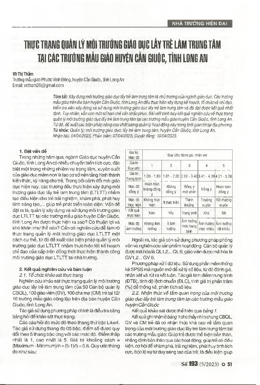 Thực trạng quản lý môi trường giáo dục lấy trẻ làm trung tâm tại các trường mẫu giáo huyện Cần Giuộc, tỉnh Long An = The reality of managing the child - centered educational environment at the Kindergartens in Can Giuoc district, Long An province