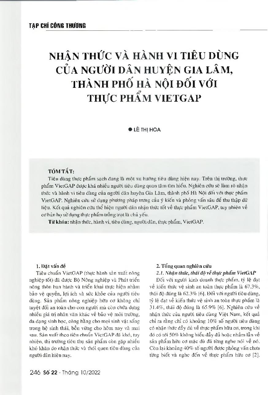 Nhận thức và hành vi tiêu dùng của người dân huyện Gia Lâm, thành phố Hà Nội đối với thực phẩm VietGAP = Awareness and behavior of consumers in Gia Lam district, Hanoi city towards VietGAP foods