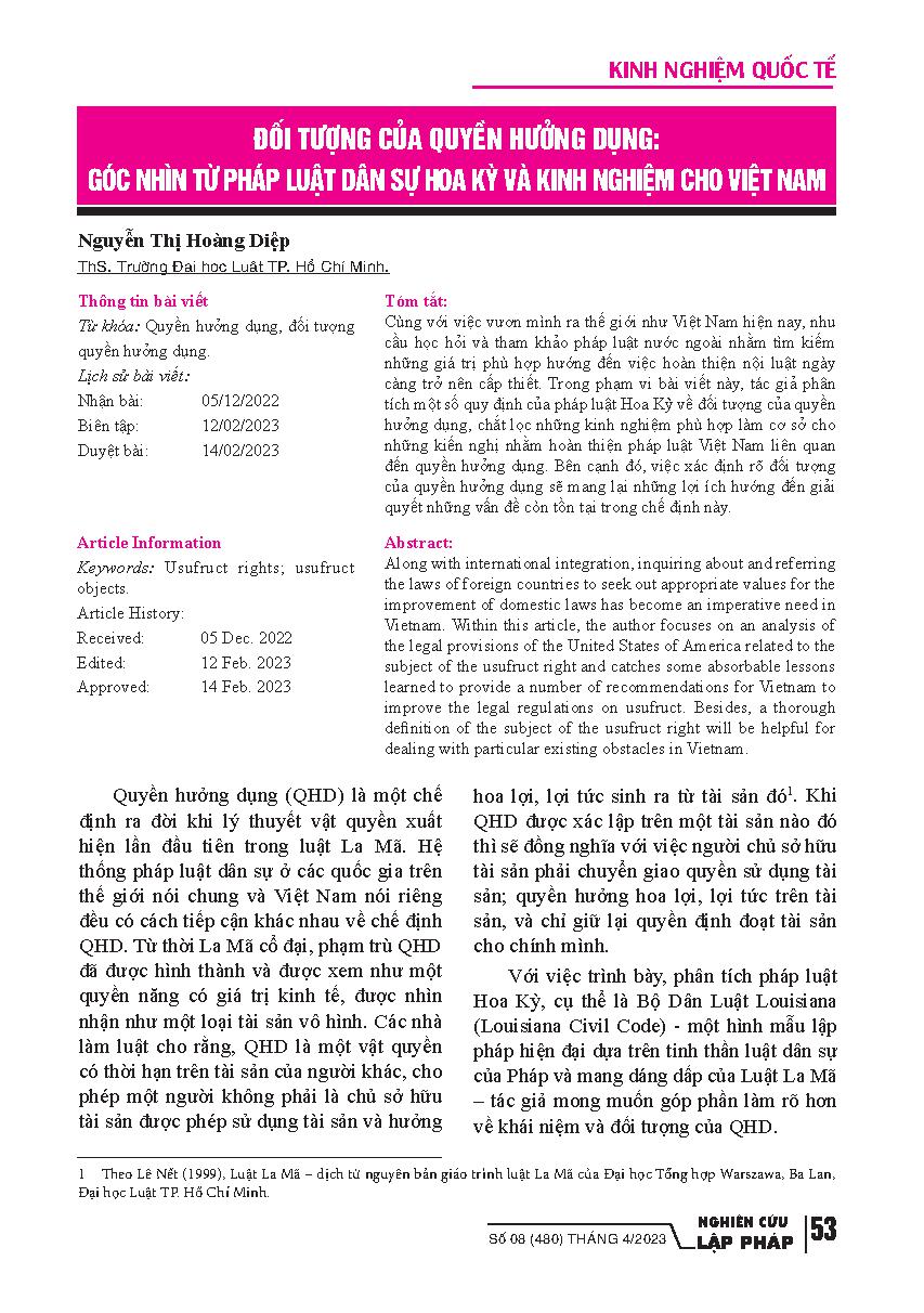Đối tượng của quyền hưởng dụng: góc nhìn từ pháp luật dân sự Hoa Kỳ và kinh nghiệm cho Việt Nam = Subjects of Usufruct Right: Perspectives from Civil Law of the United States and Lessons learnt for Vietnam