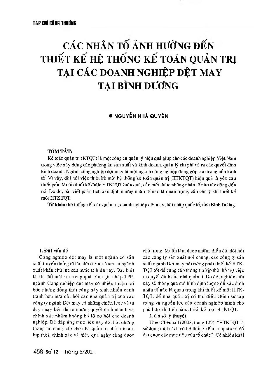 Các nhân tố ảnh hưởng đến thiết kế hệ thống kế toán quản trị tại các doanh nghiệp dệt may tại Bình Dương = Factors affecting the development of management accounting system in textile enterprises in Binh Duong Province