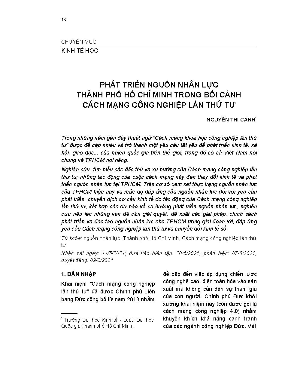 Phát triển nguồn nhân lực thành phố Hồ Chí Minh trong bối cảnh Cách mạng công nghiệp lần thứ tư = Ho Chi Minh city’s human resource development in the context of the 4th industrial revolution