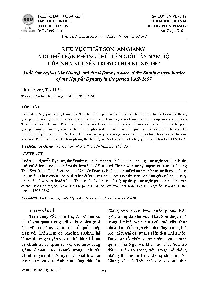 Khu vực Thất Sơn (An Giang) với thế trận phòng thủ biên giới Tây Nam Bộ của nhà Nguyễn trong thời kì 1802-1867 = That Son region (An Giang) and the defense posture of the Southwestern border of the Nguyen dynasty in the period 1802-1867