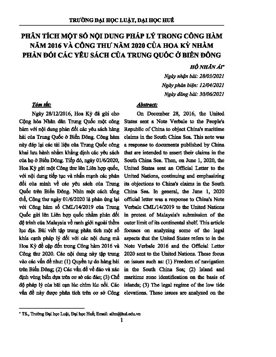 Phân tích một số nội dung pháp lý trong công hàm năm 2016 và công thư năm 2020 của Hoa Kỳ nhằm phản đối các yêu sách của Trung Quốc ở Biển Đông = Analysis of some legal contents in the 2016 note and the 2020 letter of the United States to oppose China's claims in the East Sea