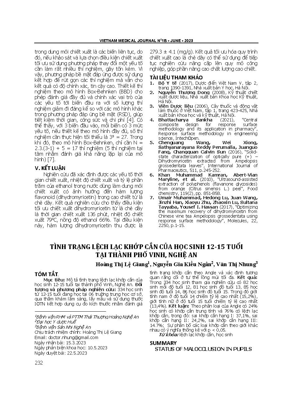 Tình trạng lệch lạc khớp cắn của học sinh 12-15 tuổi tại thành phố Vinh, Nghệ An = Status of malocclusion in pupils between the age of 12 to 15 years old in Vinh city, Nghe An province