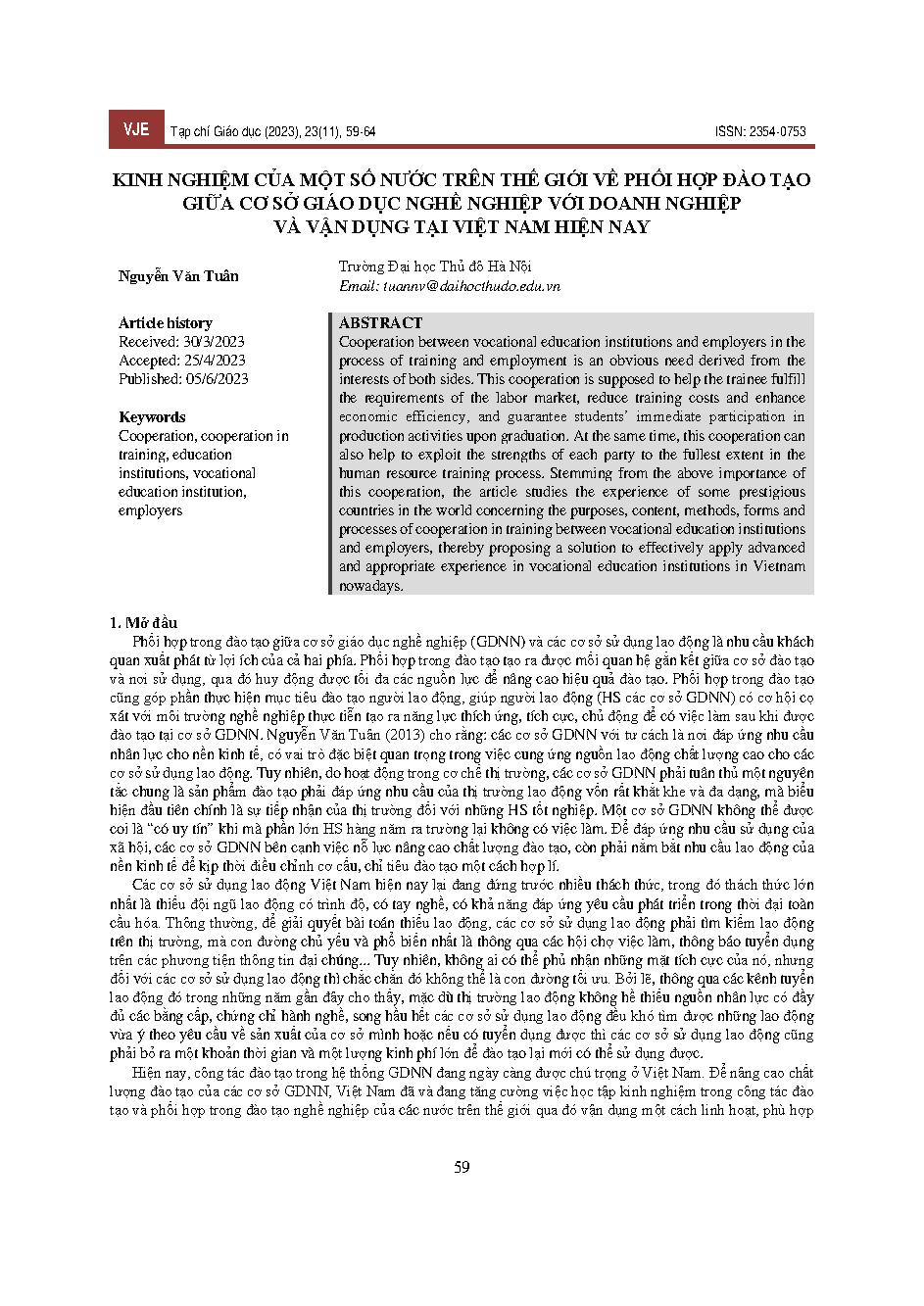 Kinh nghiệm của một số nước trên thế giới về phối hợp đào tạo giữa cơ sở giáo dục nghề nghiệp với doanh nghiệp và vận dụng tại Việt Nam hiện nay = Experiences of some countries in the world on training coordination between vocational education institution