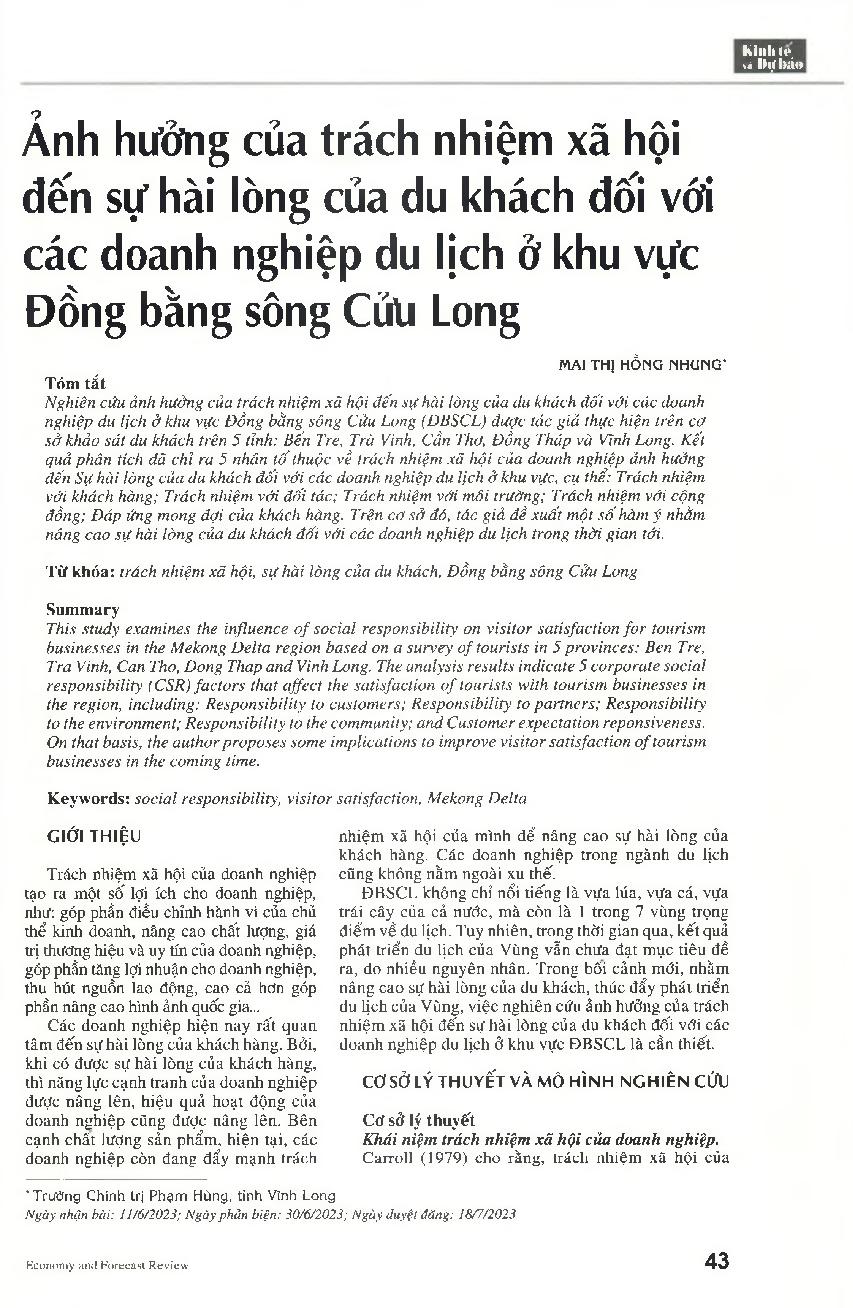 Ảnh hưởng của trách nhiệm xã hội đến sự hài lòng của du khách đối với các doanh nghiệp du lịch ở khu vực Đồng bằng sông Cửu Long